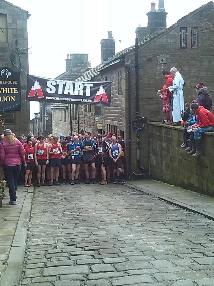 It turned out to be a nice day for 15 miles with 3200ft of ascent round Calderdale. 208 runners lined up on the cobbles in the centre of Heptonstall, with the vicar giving a sermon before starting the race with a handbell. A very good, mostly runnable route, with a welcome water/flapjack stop after about 10 miles and a killer final climb before a run in to the finish. Greg Carns finished 71st in 2:33:16. The vicar was there again at the finish serving flapjacks/biscuits/tea/coffee/water/juice. Back to race HQ, the Cross Foxes pub to watch the presentation and enjoy some free homemade soup and bread – very tasty. The race is the same weekend as Heptonstall beer festival weekend so there was time for a quick pint before heading home – with a choice of 40 guest ales it was a pity there was no nominated driver on hand... A very good race and great value at only £6 – highly recommended. Greg reckons the flapjacks were worth the entry fee alone!